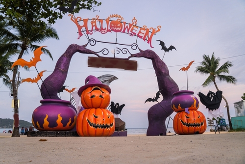 Concept:,Halloween,Beach,And,Ocean,Background,With,Spider,,Witch,And